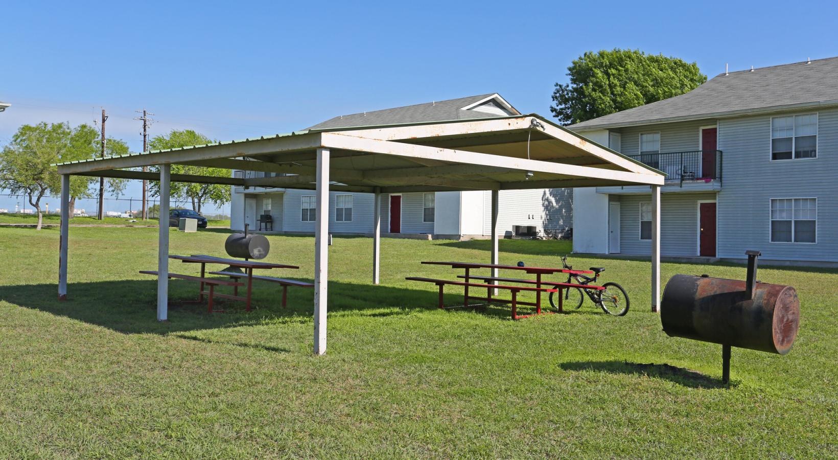 • a gazebo between apartment buildings with picnic tables and grills