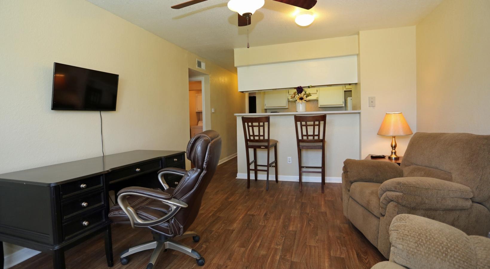• a living room with a table and chairs